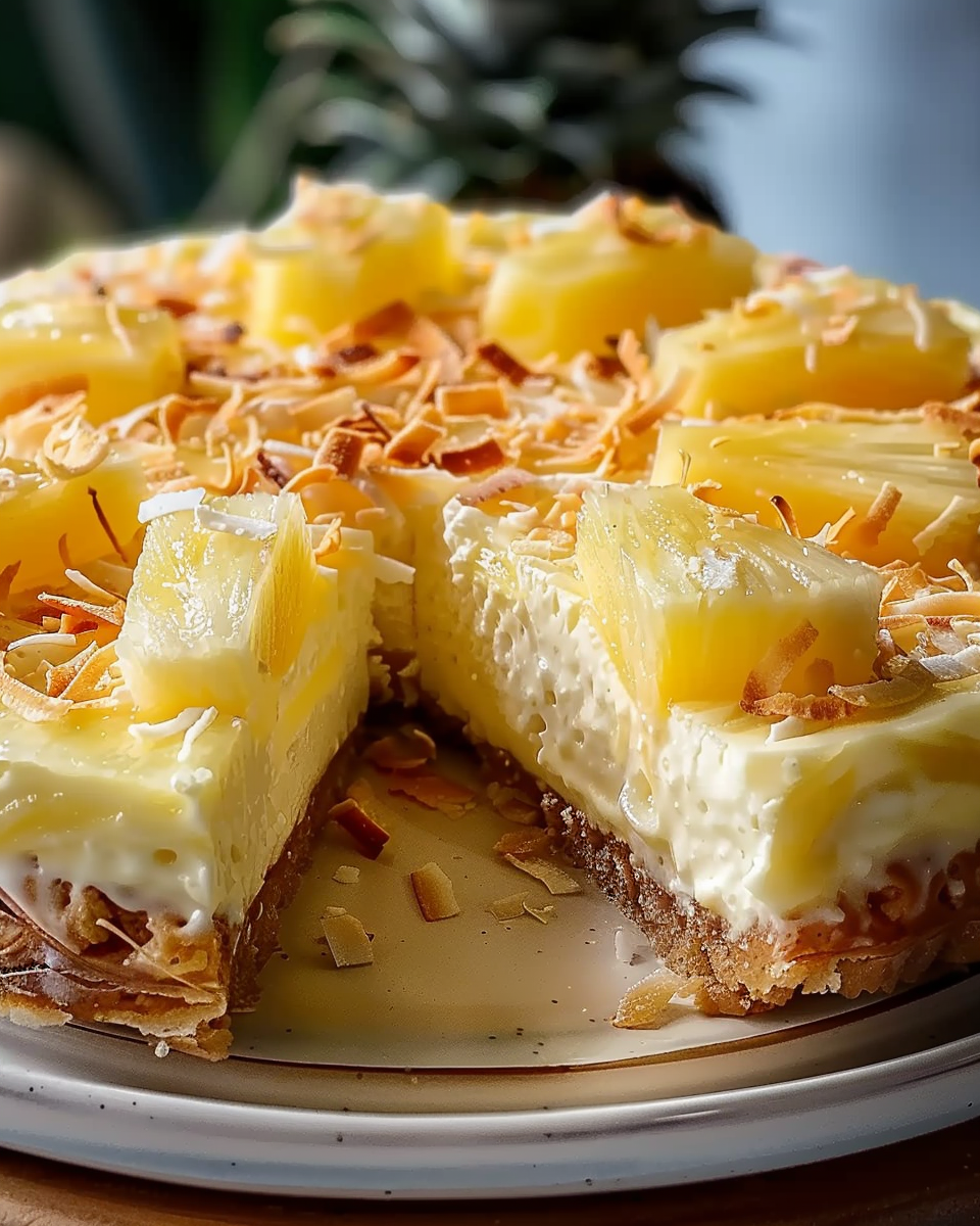 The Coconut Pineapple Cheesecake is a tropical dessert that perfectly combines the rich, creamy texture of cheesecake with the refreshing sweetness of pineapple and coconut. Ideal for summer parties, this treat brings a touch of the islands to your table with every bite. Whether you’re a cheesecake lover or just discovering the allure of tropical flavors, this dessert will surely become a favorite. The crust, made from a blend of graham crackers and coconut flakes, complements the velvety filling, creating a delightful contrast in every forkful. In this recipe, we’ll guide you through the process of creating the perfect Coconut Pineapple Cheesecake from scratch.