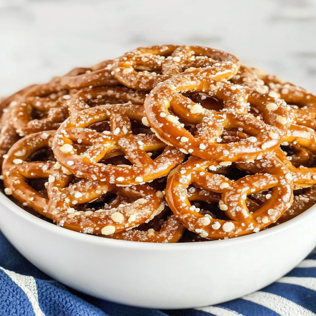 In a large bowl, pour your melted mixture over the pretzels. Toss gently until each pretzel is coated – it’s like giving them a warm hug!
