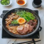 In summary, sukiyaki is a quintessential Japanese hot pot that combines savory flavors with fresh ingredients for an enjoyable meal experience. With its rich combination of thinly sliced beef, vibrant vegetables, and aromatic sauces, it showcases the essence of Japanese cuisine beautifully. Whether you’re preparing it traditionally or experimenting with vegetarian options, sukiyaki promises warmth and comfort in every bite. Gather your loved ones around the table to share this delightful dish that brings people together through delicious food and shared moments.