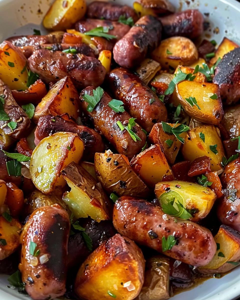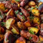 - Serve and garnish: Once the potatoes are tender and golden and the sausage is crispy, remove the dish from the oven. Garnish with fresh parsley or chives if desired, and serve hot.